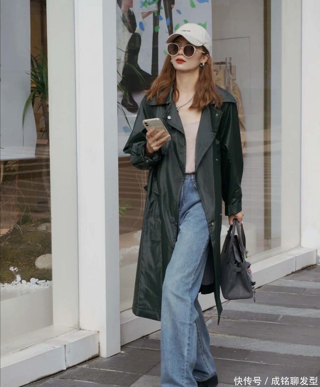 这位女士选用的是最为经典的卡其色长风衣,它具备颜色方面的平和感,也拥有配色方面的零限制,在选用裤装和它配合时,可以借助最为常规的蓝色牛仔裤的帮助,展现出来的整体基调不会肃穆沉重,有一种清爽感。