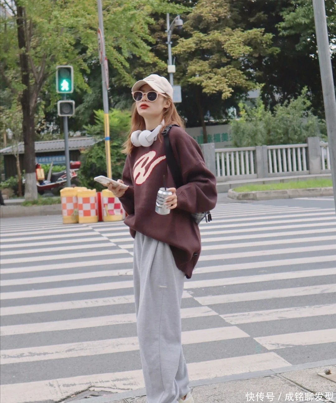 这件宽宽大大的卫衣单品,它能够展现出有点oversize的风格,强化了中性的气质,而在秋日使用这类服装,会展现出特别自然的形象。搭配一款浅色的棒球帽,不管是配合编发造型还是披发造型,都很休闲。